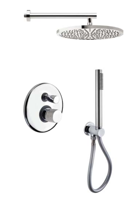 Kit composto da miscelatore incassoa due uscite, soffione anticalcare diam. 30 cm, braccio doccia metallo da 40 cm e duplex con doccino, presa acqua e flessibile da 1,2 mt.